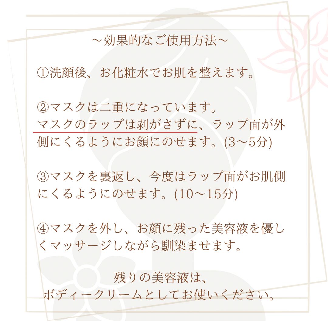 ③10分~15分ほどパックしましたらマスクを外し、美容液をお肌によく馴染ませてください。